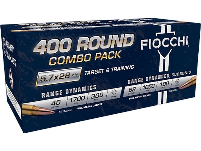 This Fiocchi Target Training Combo Pack Ammunition offers two ways to take your 5.7 firearms to the next level! Both options provide ample ammo for training with 2 boxes of Range Dynamics FMJ 40-grain Bulk packs (300 rounds) and 2 boxes (100 rounds) of Range Dynamics Subsonic for suppressed fun at the range. A perfect pairing for your next 5.7 ammunition purchase. This ammunition is new production, non-corrosive, in boxer-primed, reloadable brass cases.
